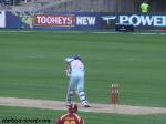 | Glenn McGrath, playing his last game, has a bowl |